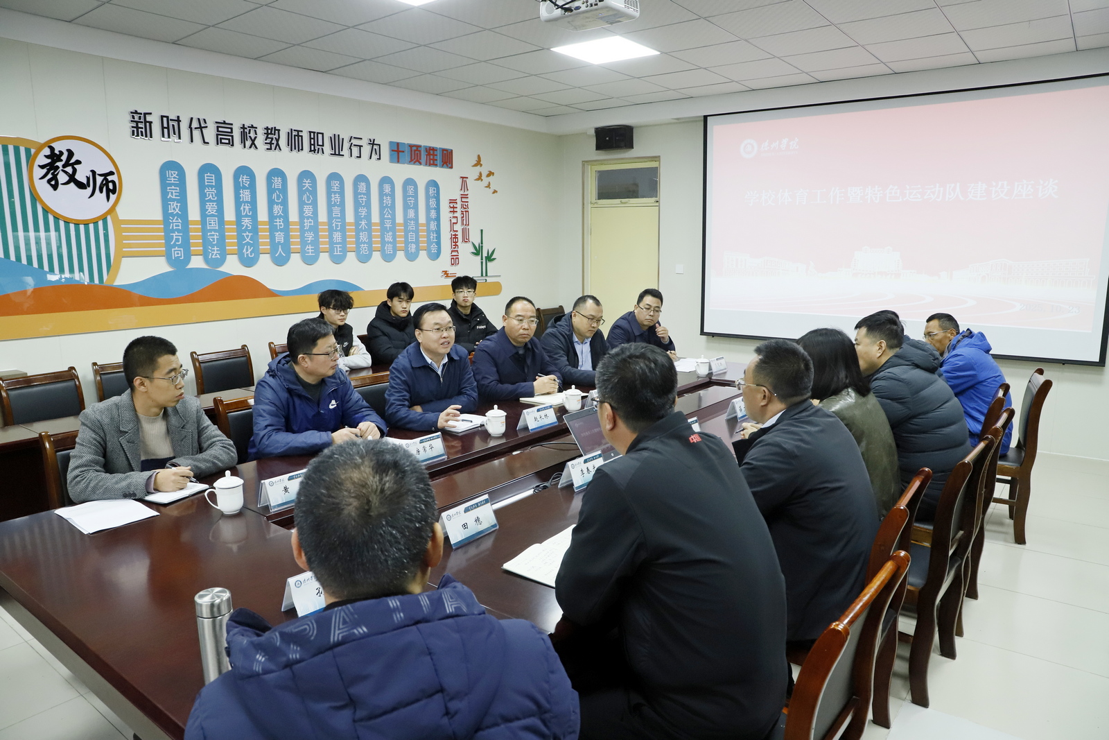 10月23日下午,党委副书记、校长赵长林带队到体育学院调研藤球队建设工作,并与藤球队师生座谈交流。