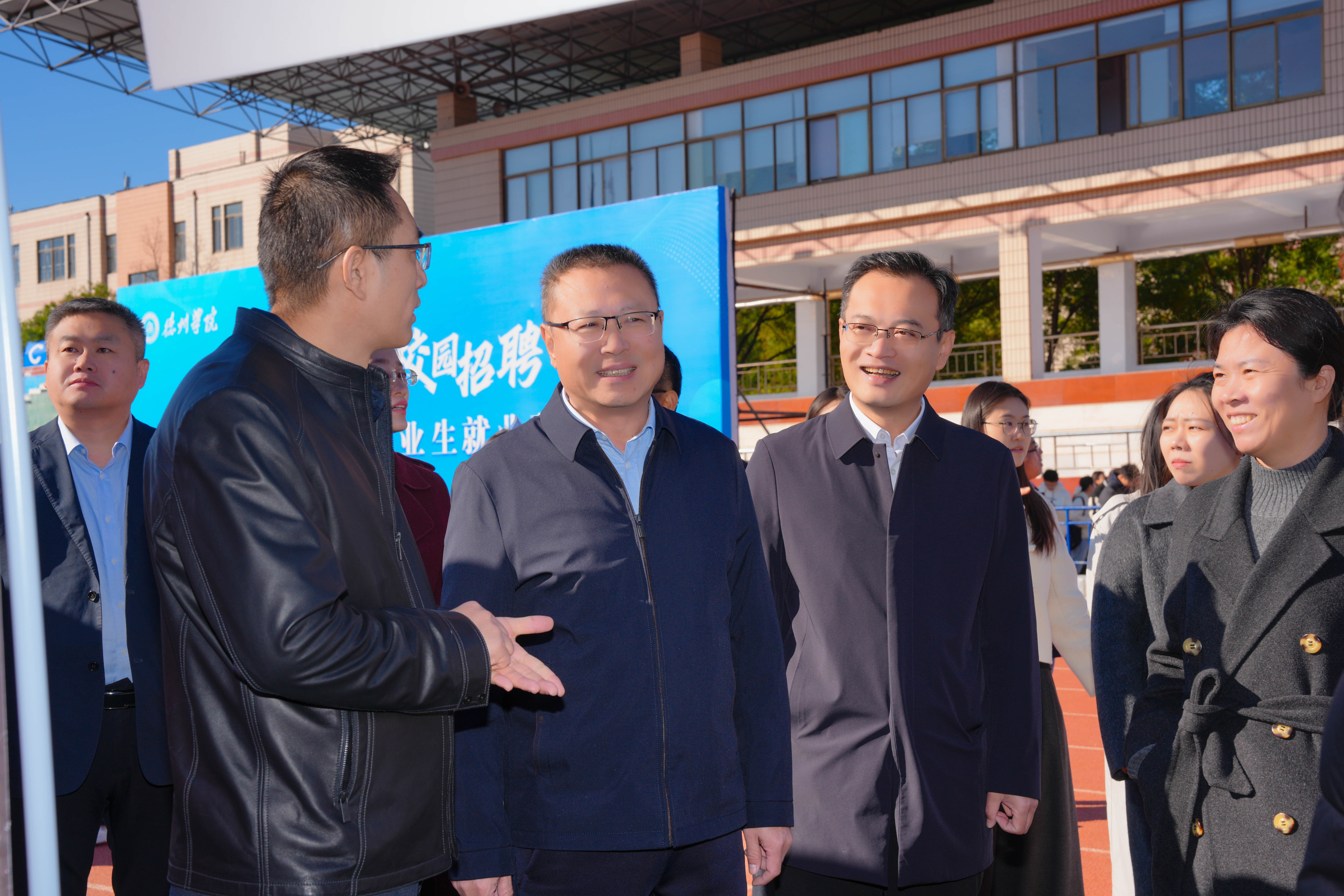 为深入贯彻党的二十届四中全会精神,认真落实党中央、国务院关于就业工作的决策部署,抢抓秋招关键期。11月2日,“金秋启航”德州学院2026届毕业生就业双选会在体育场举行。党委书记吴君,党委委员、副校长蒋涛涛来到招聘会现场指导工作,深入了解用人单位招聘需求和毕业生就业情况。