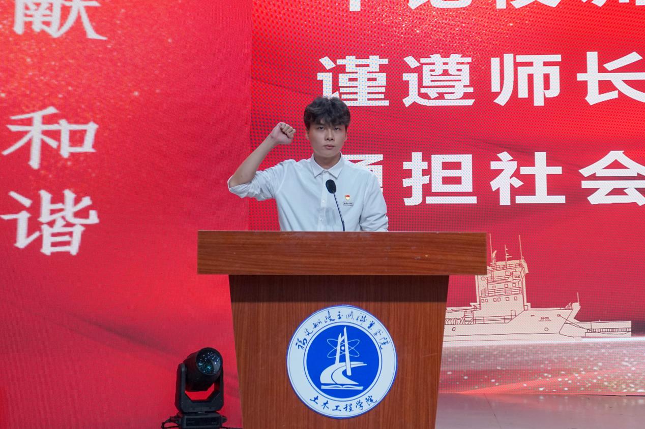 在毕业宣誓环节,全体毕业生在谢剑楠同学的带领下庄严宣誓,铿锵誓言展现出他们牢记校训院训、勇担社会责任的决心。