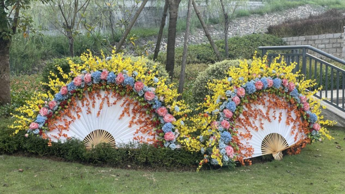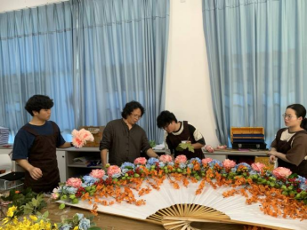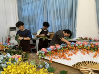 实操环节中,师生们围聚在操作桌前精研细琢。面对比普通折扇大十倍的创作载体,陈荣顺老师通过竹竿与扇骨的巧妙衔接实现力学平衡。"注意主枝走向要呼应扇骨弧度""配材色彩需形成补色关系"—他穿梭于各组作品间精准点拨,手把手校正学生持剪角度。历经五个小时的匠心雕琢,两幅融合宋式审美与现代构成的作品惊艳亮相。作品中线条错落有致、布局虚实相生、色彩热烈大方,充分展现了园林学子的巧思与匠心。