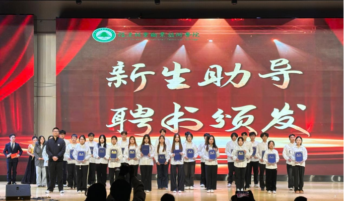 晚会尾声,颁奖环节隆重举行:红歌班班唱比赛获奖结果揭晓,院系领导分别为一、二、三等奖及优秀奖获奖班级颁奖,以表彰同学们在红歌演唱中的精彩表现,向大家为青年学子的红色情怀与奋进姿态送上肯定与鼓励,获奖班级代表手持荣誉奖杯定格荣耀瞬间。随后举行助导聘书颁发仪式,系部新生辅导员为受聘助导颁奖,感谢他们为新生成长付出的辛勤努力,现场掌声不断。