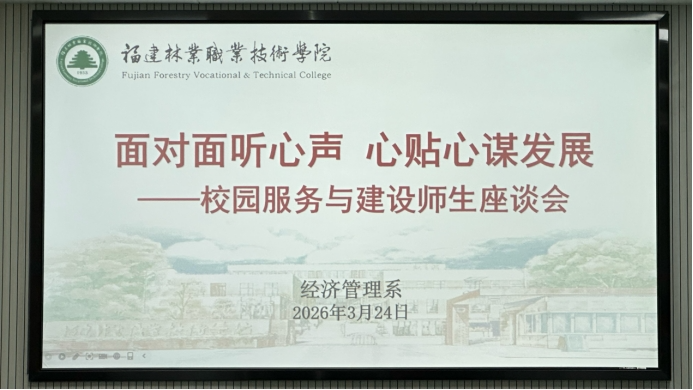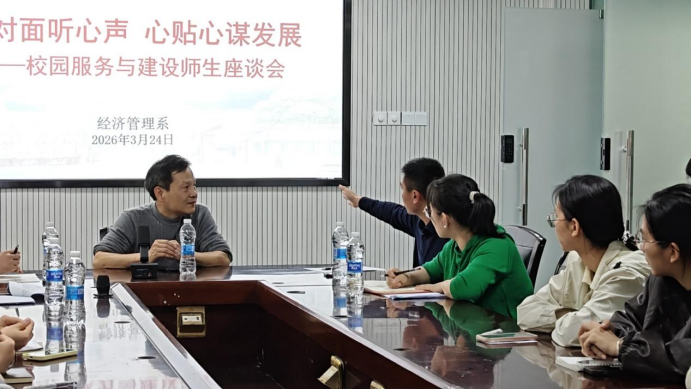 为充分倾听学生心声、汇聚学生智慧,鼓励学生为校园建设发展积极出谋献策,2026年3月24日,经济管理系在“一站式”学生社区二楼会议室召开了“校园服务与建设师生座谈会”。会议以“面对面听心声,心贴心谋发展”为主题,由经济管理系党总支书记陈剑勇主持,副院长黄晖、后勤处处长薛翔鸿、系主任林文胜、系党总支副书记张翼翔、学生科负责人黄玲与学生代表们齐聚一堂,展开了一场真诚而深入的对话。