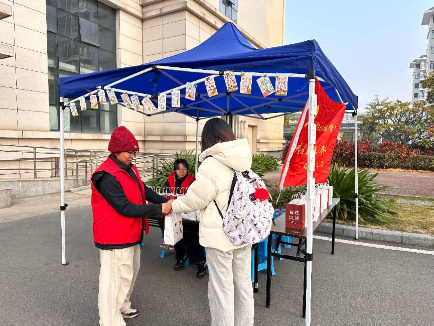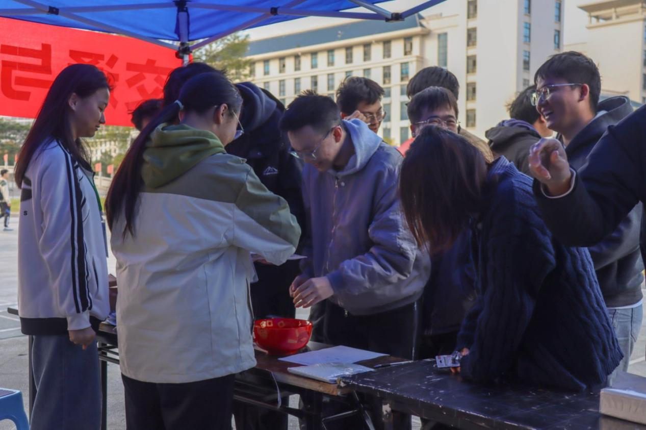 12月14日,在福州大学城校区东广场前,志愿者们已提前布置好各类活动摊位及考研文具礼包,静待“研”途奋斗者的到来。现场设置了“幸运刮彩”“闽韵博饼”“上岸投壶”等活动,既寓意好运伴随、金榜题名,也借助传统文化体验舒缓备考压力,为考研学子注入温暖与力量。