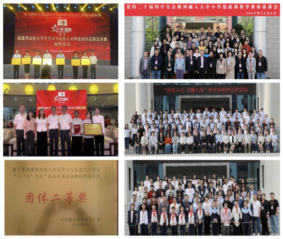 坚持社团育人、赛学育人、大中小一体化育人深度融合。指导学生社团从3个增至7个,新思想读书社成功入选省级马克思主义理论学生社团。赛学结合成效显著,指导学生获教育部“我心中的思政课”大学生微电影展示活动一等奖、全国高校大学生讲思政课公开课展示活动三等奖等国家级比赛奖项8项,全省高校“一‘马’当先”知识竞赛二等奖(团体总分第二名)等省厅级奖项20项。牵头成立“1+N”大中小学思政课一体化建设联盟,推动“联盟+平台+行动”一体化工作机制,并依托省级高校哲学社会科学讲坛“马克思主义讲坛”,围绕“弘扬八闽优秀文化”“赓续红医精神与中医药文化”“温‘习’文化情,奏响新福章”等主题举办专题讲座、研讨会、教学展示活动,形成循序渐进、螺旋上升的育人共同体,相关实践获学习强国、福建高校思政网、福建卫生报等主流媒体专题报道。