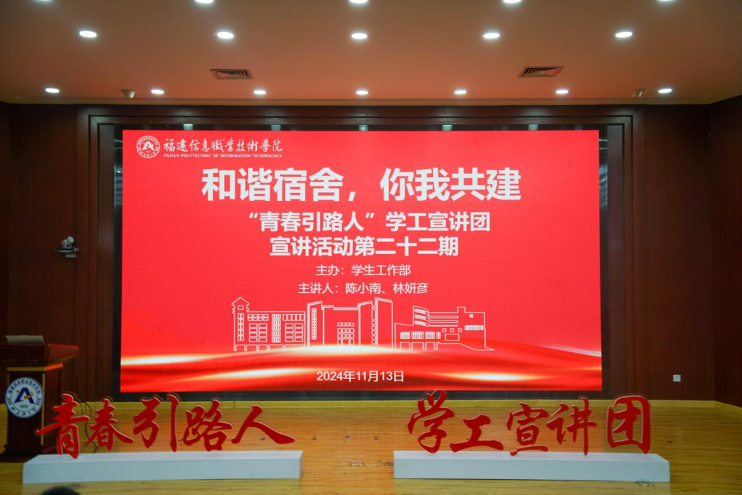 2024年11月13日,第二十二期宣讲活动在平潭校区学术报告厅举行。本次宣讲活动的主题为“和谐宿舍,你我共建”,由智能制造学院辅导员陈小南、文化创意与旅游学院辅导员林妍彦主讲,各二级学院学生代表参加此次活动。