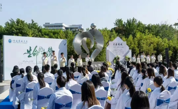无言良师纪念园坐落在福医良师楼旁,建有无言良师碑、感恩林及医学发展史轴线地刻,是缅怀大体老师、宽慰亲属、鼓舞世人,引领博爱奉献、感恩生命的特色医学美育景观,获评校大思政教育基地、廉洁文化基地等。一场场跨越时光对话。当悠扬的旋律和着片片黄花下落的旋转,无言良师音乐诗会正为医学生们浸润着生命的礼赞。每年清明节前夕,学院都举办无言良师音乐诗会,用歌声、乐声、诵声献礼大体老师,将生命教育、感恩教育与美育教育紧密结合,引导学生致敬无言良师、体悟生命的可贵。一次次无声敬畏。学院坚持开展“解剖第一课”,引导学生每次解剖课前都向大体老师鞠躬默哀,用无声的敬畏书写每一个美育教育的篇章。学院还组织师生开展“生命永恒”器官捐献宣传教育活动、“大体”老师家属探访活动、,扩大生命教育的影响力、感染力。一声声创新转化。“我不知道你是谁,但我知道你为了谁”躺下去是冰冷的躯体,立起来却是医学的丰碑。我院师生从大体老师身上习得的医学知识创造性转化为医学歌曲,举办多场医学歌曲大赛,荣获“金斯瑞杯”中国大学生生化歌曲特等奖1项、二等奖1项。师生还在实验课堂上用“菌苔”作画,在探索生命奥秘的同时,感受科学之美、艺术之美。