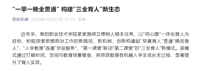 阜阳职业技术学院通过系统化构建全时段、全周期、全维度的“三全育人”新模式,实现了思政教育在时间上纵向延伸、在周期上全程覆盖、在场域上横向拓展,形成了“时时有思政、事事见思政、处处显思政”的生动局面,为新时代高职院校思政工作提质增效提供了可资借鉴的实践范例。(张冲)
