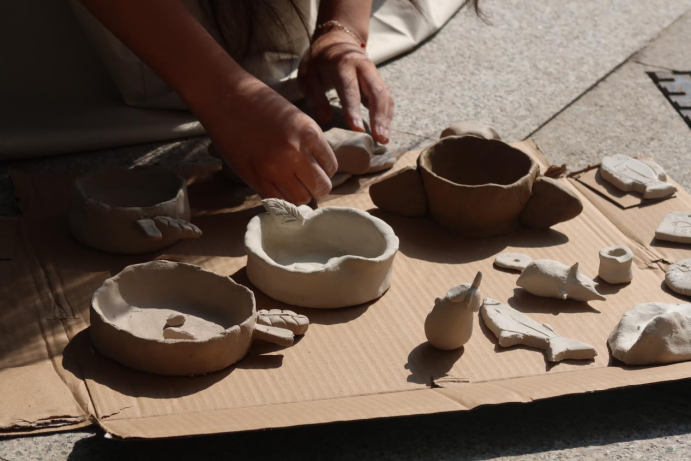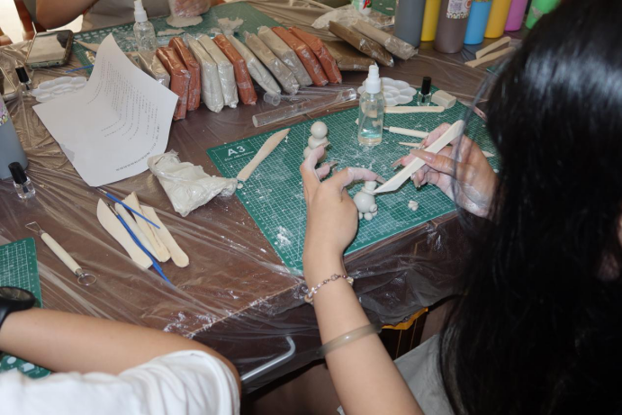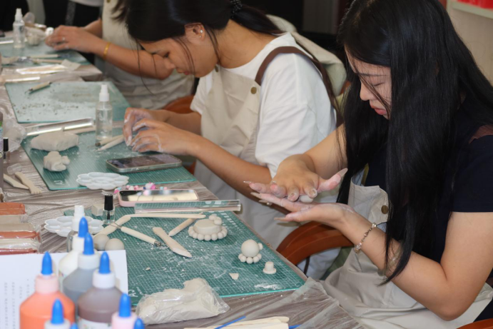 遇见‘泥’自己” 陶泥手作环节备受大家喜爱,同学们围坐桌前,将柔软的陶泥在指尖揉压塑形,感受泥土粗粝却温暖的触感。专注于捏制、拓印的过程中,课业压力化作指缝间挤出的泥条,焦虑随着按压的纹路渐渐摊平,现场不时响起轻松的交流笑声。这场活动以最质朴的手作形式,让同学们在与陶泥的互动中卸下心防,于方寸之间寻得情绪的出口,用专注与触感为心灵注入了一份难得的宁静松弛。