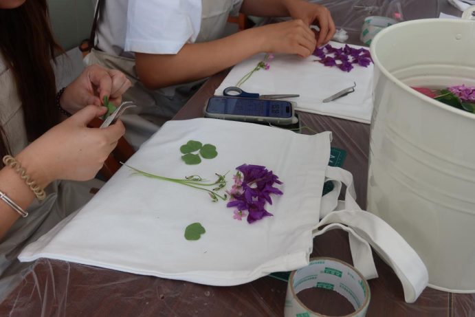 以自然为画布开启五感疗愈之旅,学生选取带露玫瑰花瓣、薄荷叶、银杏等新鲜植物,平铺于纯白帆布包,盖棉布后用木槌匀速敲击。叶片汁液渗透纤维,布面染出天然色块,叶脉纹理清晰。过程中,植物清香萦绕,指尖感受湿润触感,焦虑压力随敲击消散。最终拓染图案定格植物生命形态,成情绪可视化作品,背包承载自然美学与宁静心绪,见证人与自然对话。