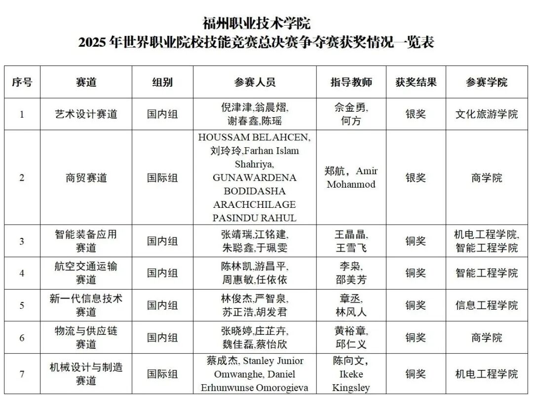 近日,2025年世界职业院校技能大赛总决赛争夺赛圆满落幕。学校共有20支队伍入选福建省代表队,参加了15个赛道的激烈角逐,斩获银奖2项、铜奖11项(其中国际组银奖1项、铜奖7项),充分展现了学校的育人成效,更以国际组8项奖项彰显了良好的国际化办学水平。