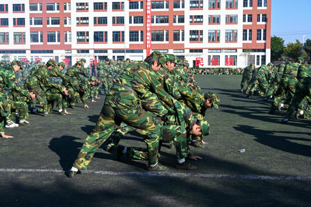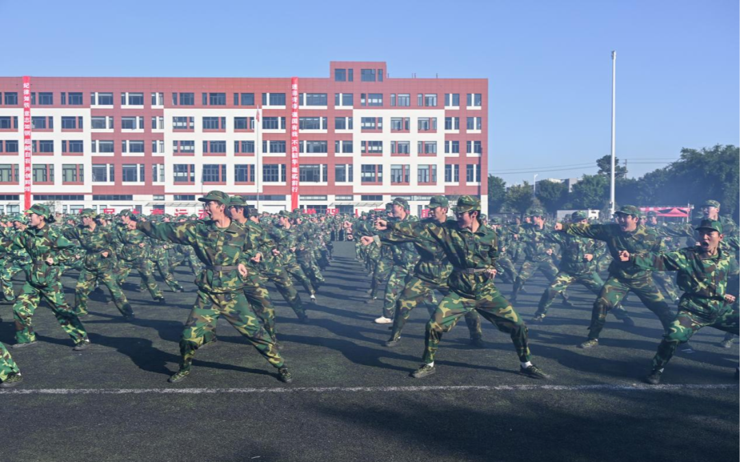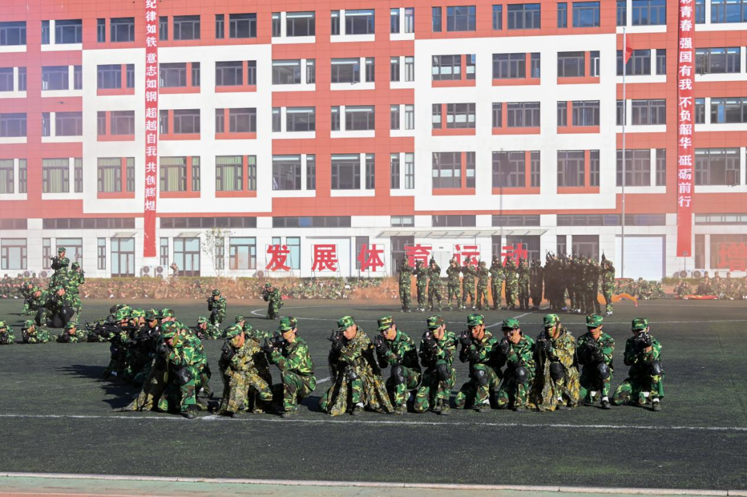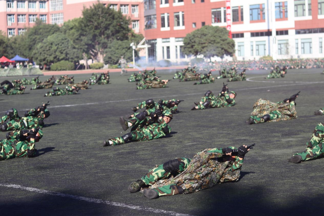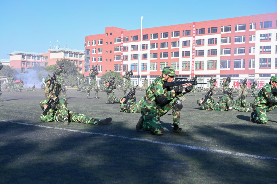 分列式率先登场!学子们迈着铿锵步伐,喊着嘹亮口号,精神抖擞地走过主席台;队列示范班动作精准划一,尽显军人风范;军体拳、刺杀操、擒敌拳接连上演,出拳有力、踢腿生风;战术基础动作展示中,卧倒、匍匐连贯利落,仿佛置身实战,赢得阵阵喝彩。