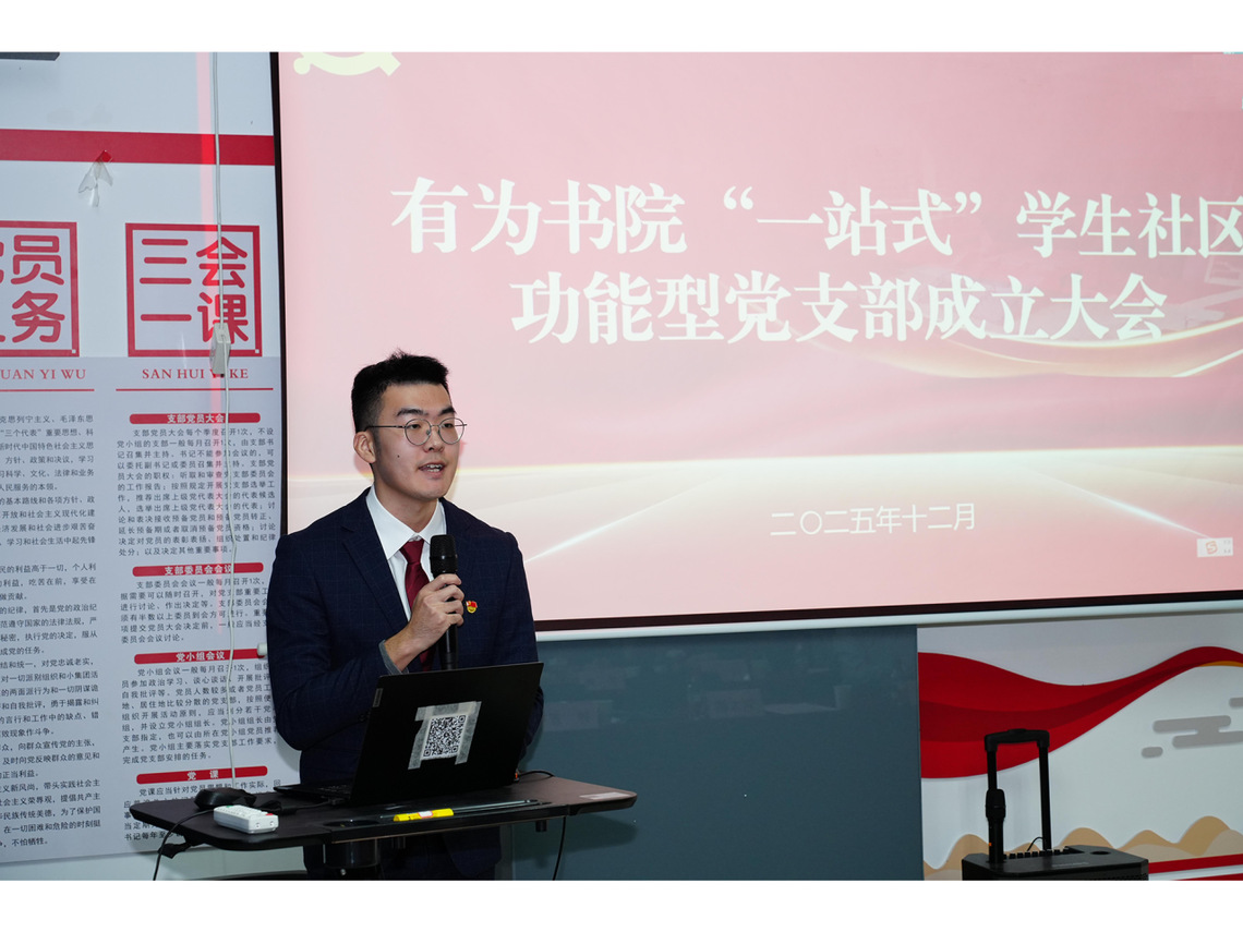 邱启彬在总结讲话中代表学校党委组织部对功能型党支部的成立表示祝贺。他指出,成立功能型党支部是学校以党建为引领、激活社区管理服务实效的重要举措,提出功能型党支部要筑牢“建设”之基、紧扣“铸魂”之要、聚焦“赋能”之实和立足“有为”之志,不断提升学生功能型党支部的组织力、引领力和服务力。