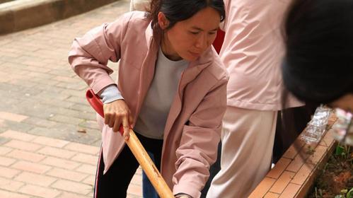 领取工具后,全体同学按照预先分组迅速进入各自负责区域开始劳作。