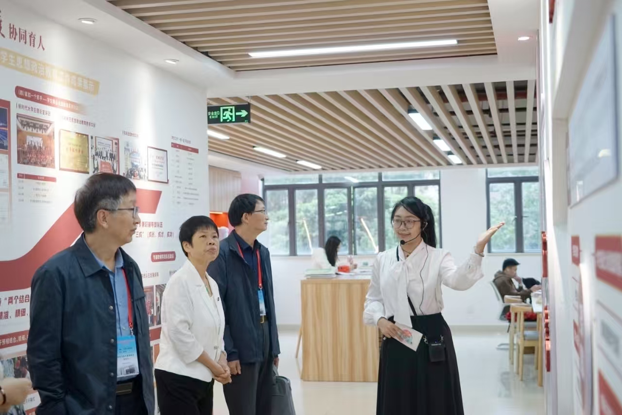 学校新时代大学生理论宣讲团成员李沁瑶、黄雅雯作为宣讲员带领与会人员参观了广东第二师范学院“一站式”学生社区服务中心思政空间。