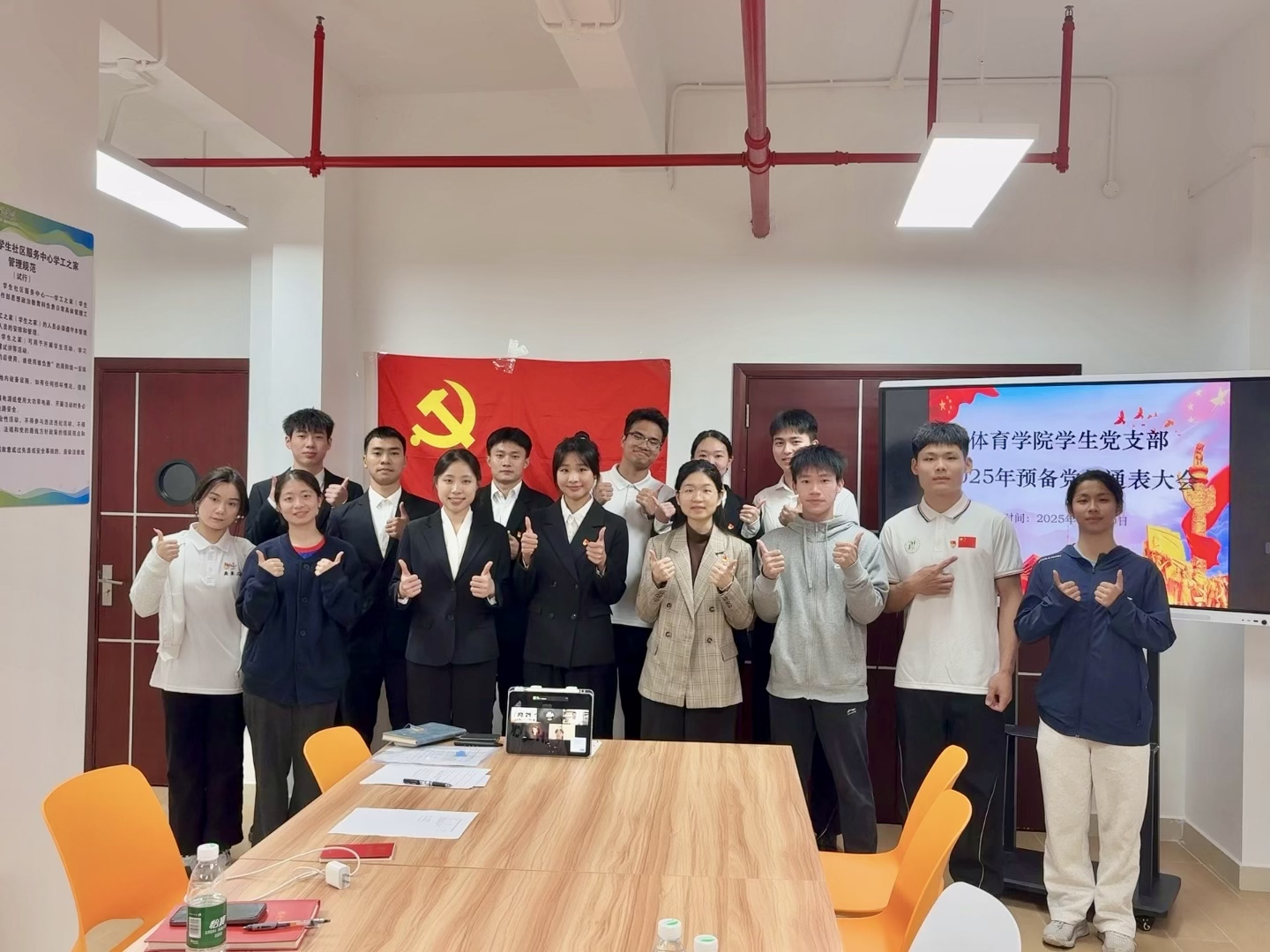 2025年12月10日,体育学院学生党支部在花都校区一站式社区205活动室召开预备党员通表大会与预备党员转正大会,严格遵循党员发展工作规范流程推进各项议程,退役大学生士兵党支部书记欧阳颖诗同志、支部正式党员、预备党员及发展对象参会。预备党员通表大会伊始,主持人汇报筹备情况,确认各项准备就绪、参会人员符合规定后,全体人员起立奏唱国歌,大会正式启动。会上,发展对象依次汇报个人思想、学习、工作情况,清晰阐述入党动机与对党的认识;到会正式党员结合汇报内容提问了解其综合素养,入党介绍人分别说明发展对象培养考察情况并明确入党资格意见。