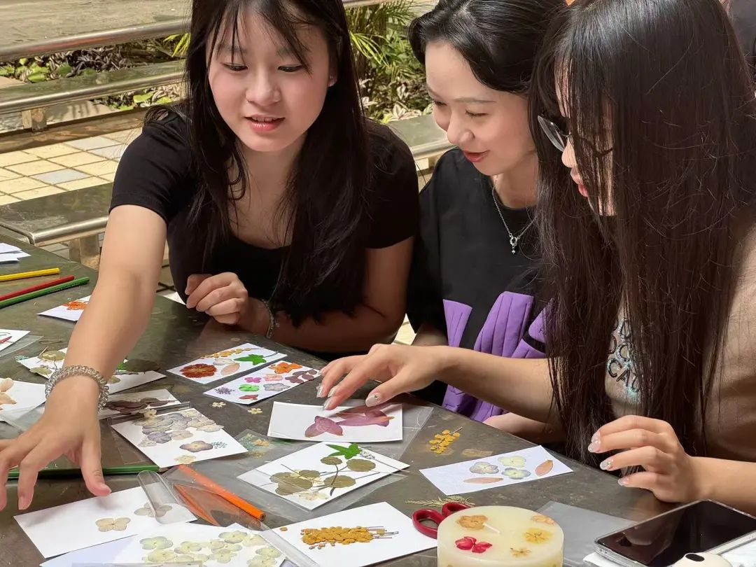 同学们围坐在一起,迫不及待地开启压花书签创作。大家精心挑选花瓣,尝试不同排列。陈蓉老师手把手调整花瓣位置,一边调整一边耐心讲解,让同学们明白不同位置呈现的效果差异;林月明老师则专注于示范粘贴技巧,从胶水的用量到涂抹的角度,细致入微,还不时停下来答疑解惑。在两位老师悉心辅助下,在刘紫晴同学耐心讲解和工作人员的协助下,不多时,一枚枚饱含巧思的精美书签便诞生了,大家脸上洋溢着自豪与喜悦。
