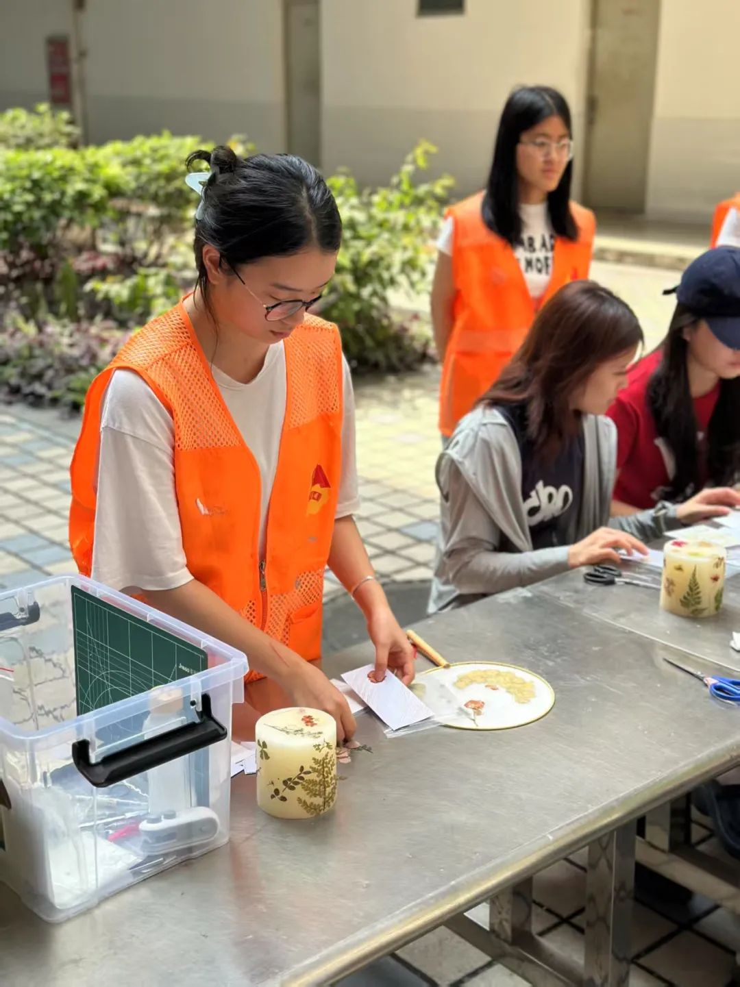 作为 2024 年世界职业院校技能大赛(花艺)竞赛银奖的获得者,刘紫晴同学在压花制作领域有着深厚的专业知识和丰富的实践经验。在此次活动现场,她手持压花材料,凭借着对压花艺术的精通,细致入微地向同学们讲解压花 DIY 书签的步骤与技巧。同学们全神贯注,目光紧紧追随着刘紫晴同学的每一个动作,积极踊跃地与她互动。整个现场气氛热烈非凡,大家都沉浸在压花艺术的独特魅力之中。