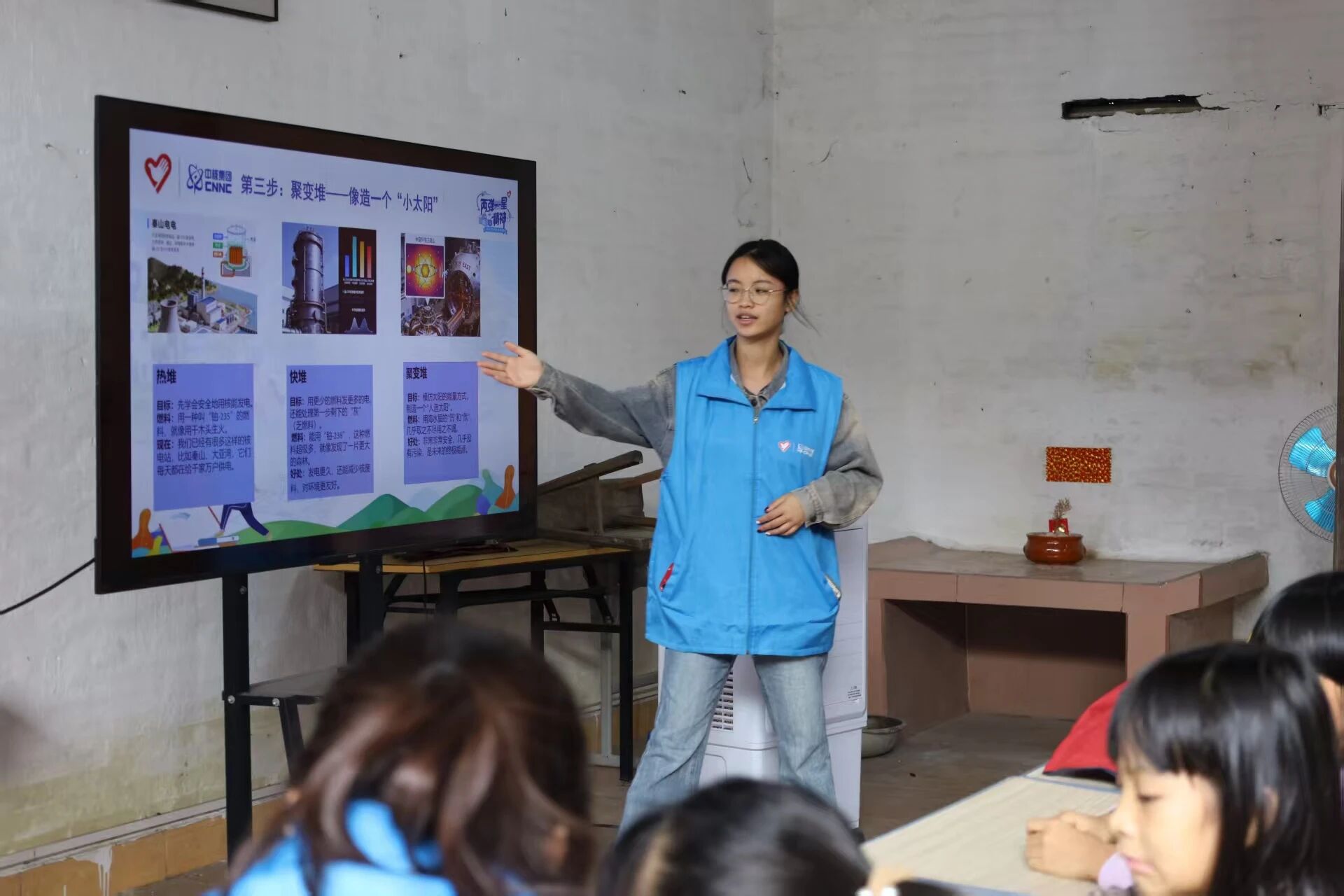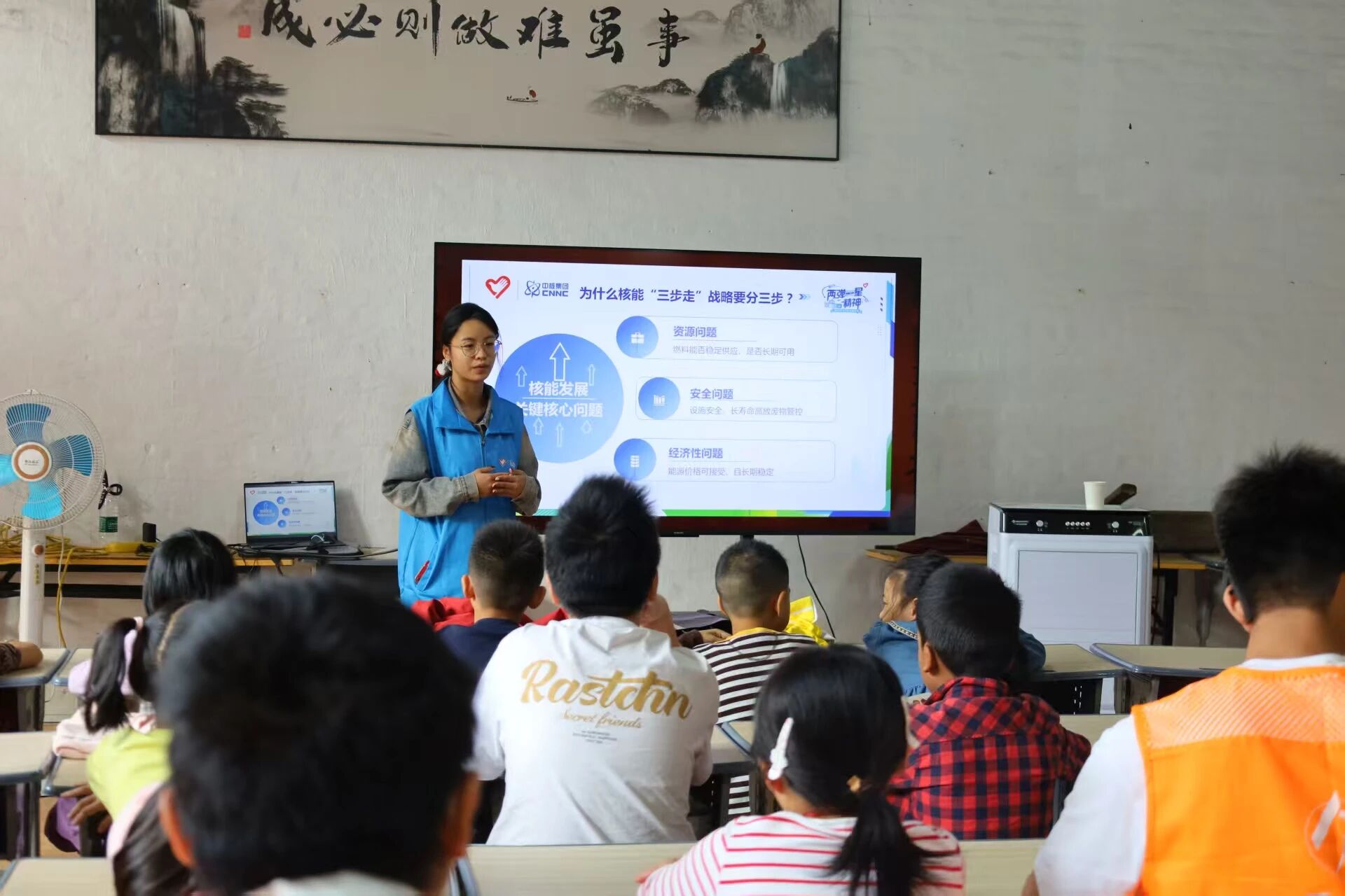 活动开始前,先由全国“两弹一星”宣讲团(人居环境学院青年志愿实践队)的陈薏茹同学给小朋友们带来精彩宣讲。她以“是什么、为什么、怎么做”的清晰逻辑,生动拆解核能发展“三步走”脉络:从科普核能的基础概念,到阐释我国研制“两弹一星”的时代意义,再到分享科研先辈的探索历程。通俗易懂的讲解搭配鲜活案例,让抽象知识变得具象可感,更让小朋友们深刻体会到“两弹一星”精神内核,在心中悄悄播下崇尚科学、致敬先辈的种子。