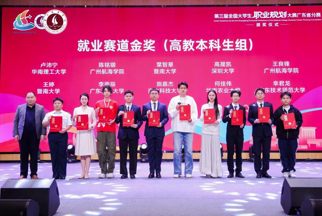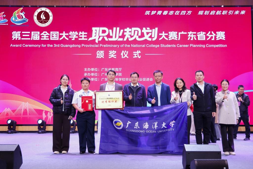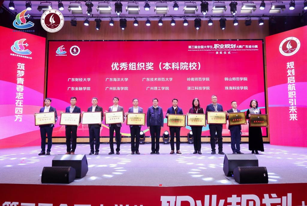 1月31日,第三届全国大学生职业规划大赛广东省分赛在广州航海学院举办,经过激烈角逐,我校5名学子凭借卓越表现斩获1金4银,金奖选手成功晋级国赛排位赛。同时,刘爽老师荣获“优秀指导教师”称号,学校更首次斩获该项赛事“优秀组织奖”,成为全省10所获此荣誉的本科院校之一,创下学校在该项赛事历史最佳成绩,充分彰显了就业育人工作的突出成效。当晚,学校党委副书记谭平,学生工作部部长、招生与就业指导中心主任郑一鸣出席活动颁奖典礼。