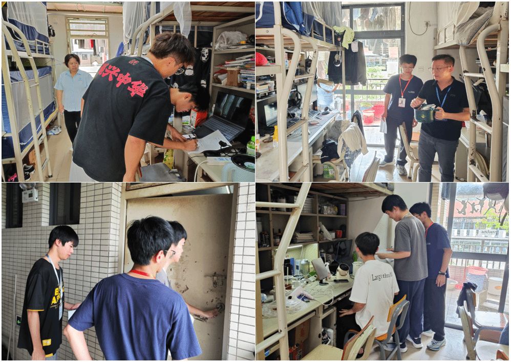 在检查过程中,检查人员分楼栋、楼层围绕宿舍安全隐患开展全覆盖检查,通过“查、讲、改”三步法落实工作:一查安全隐患,针对宿舍内是否存放使用违规电器、私拉电线及存放管制刀具、门窗和床板是否有损坏等问题建立台账;二讲安全知识,结合高校学生宿舍安全事故案例,向相关违纪学生普及用电规范、消防安全等知识;三促立行立改,对存在问题的宿舍现场要求进行整改并记录跟进复查。
