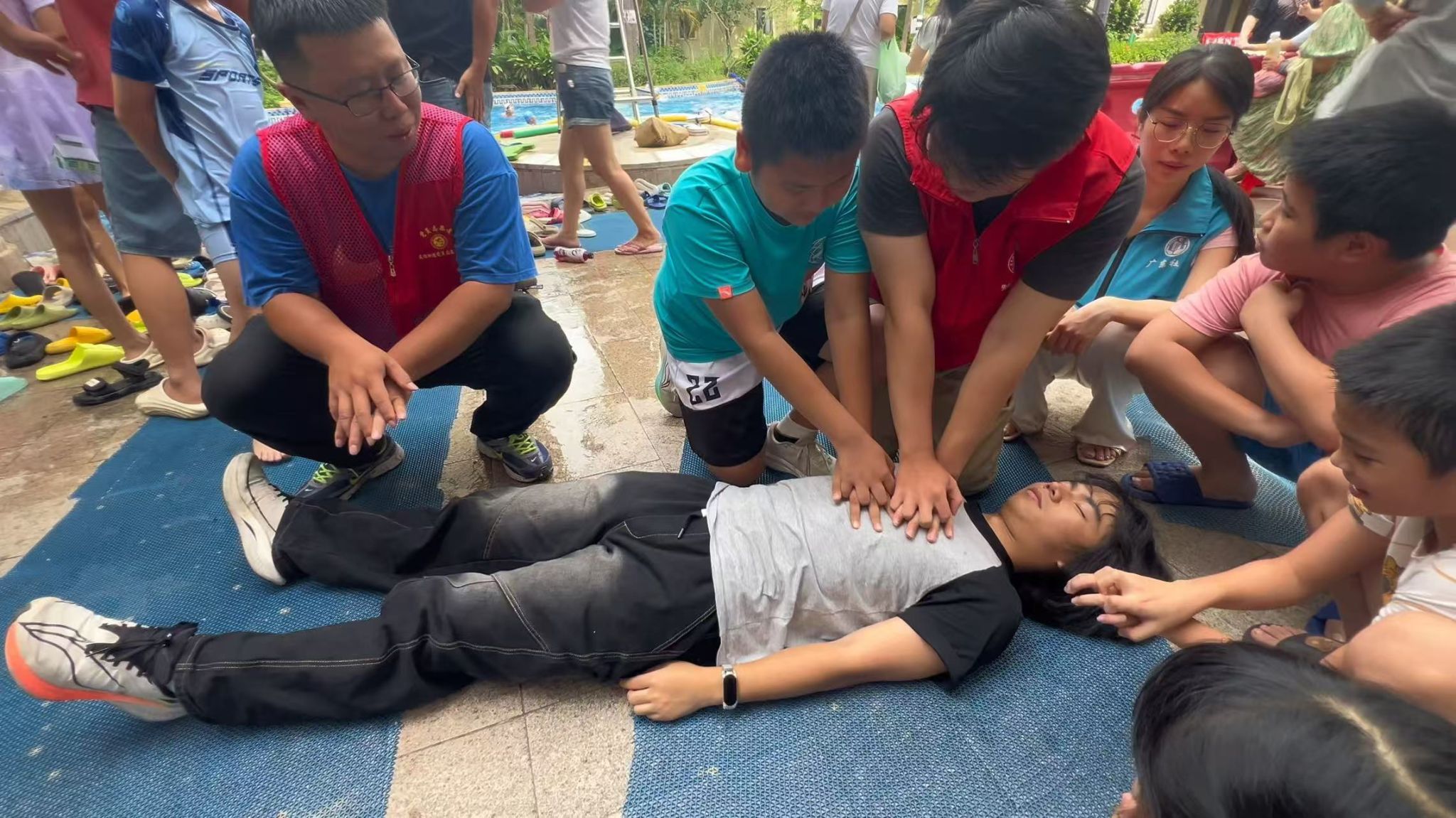 7月15日,先锋队聚焦青少年暑期安全,推出“防溺+食安”组合宣讲。先锋队成员游景峰等人通过情景模拟,生动演示了溺水时的自救手势与岸上救援心肺复苏技巧。他们特意选取社区泳池边作为模拟环境,让整个演示更具代入感。