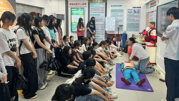 精训急救技能守护生命。应急救护实操为活动重点,新生全员接受心肺复苏(CPR)与AED操作培训。学生讲解员通过假人模型演示,明确CPR按压频率、深度及AED操作全流程,新生代表有序实操,扎实掌握“救命知识”,为生命安全增添保障。