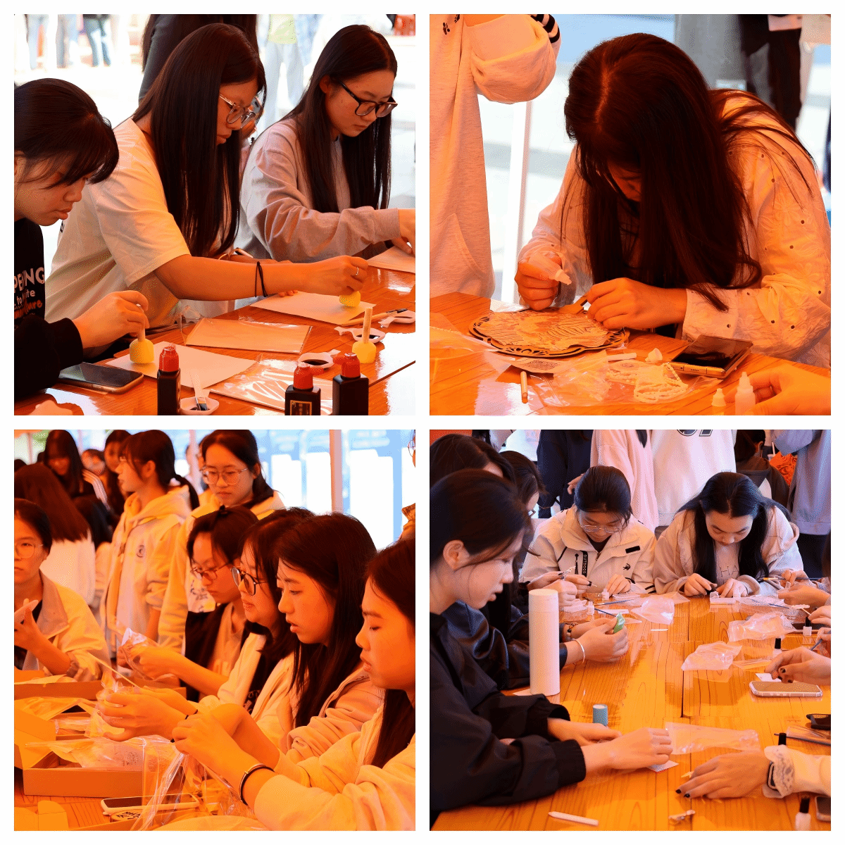 现场设置了掐丝珐琅、幻彩螺钿、宋锦团扇、古法拓印、脸谱绘制、剪纸纳福等10项非遗体验项目,吸引众多同学热情参与,气氛热烈浓厚。