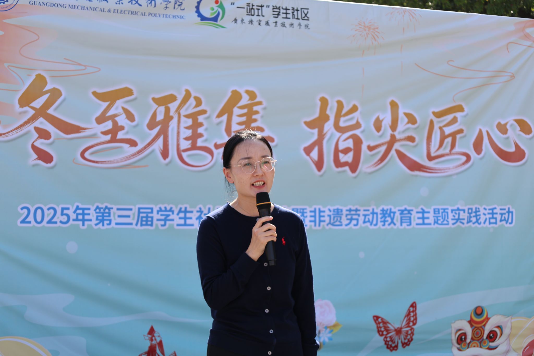 冯清云在致辞中指出,学校始终将“一站式”学生社区建设作为落实“三全育人”的重要抓手。此次把文化节与非遗劳动教育引入社区,打破了课堂与生活的壁垒,让同学们在“家门口”触摸文化温度、体验劳动乐趣,是深化社区育人功能的生动实践。她强调,劳动教育是培养高素质技能人才的关键一环,非遗技艺是中华民族的历史记忆和文化载体,承载千年文脉,凝结先辈智慧。她寄语同学们沉心动手、用心体验,感受非遗技艺之精妙,体会劳动创造之价值,争做中华优秀传统文化的“传承者”与“传播者”。