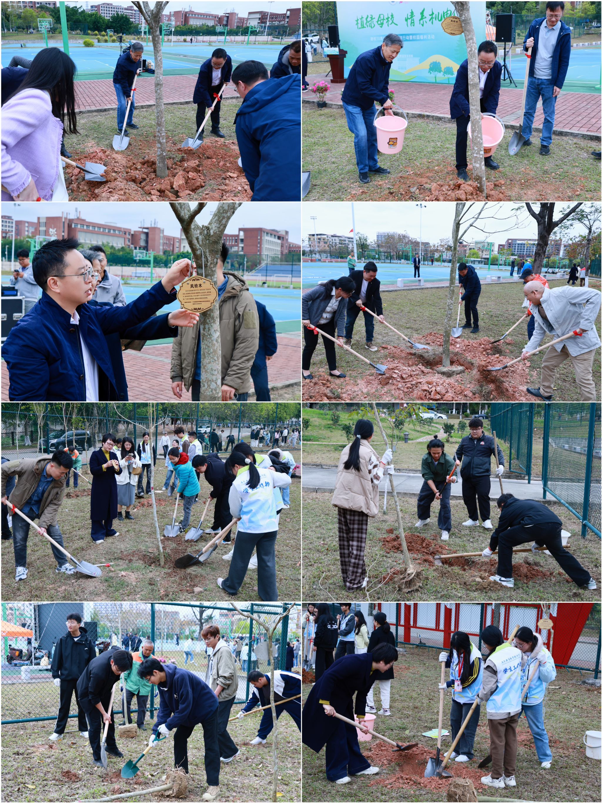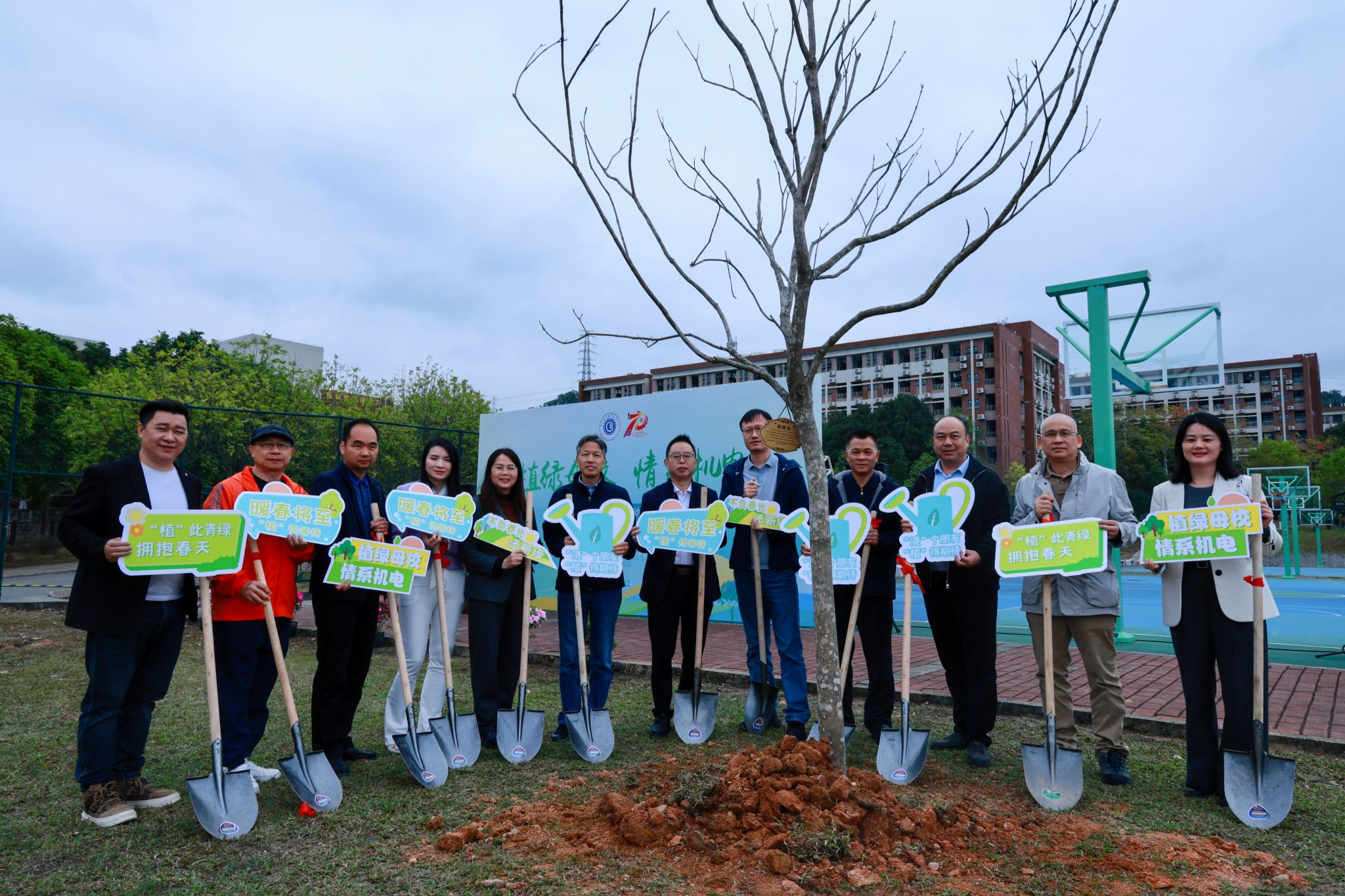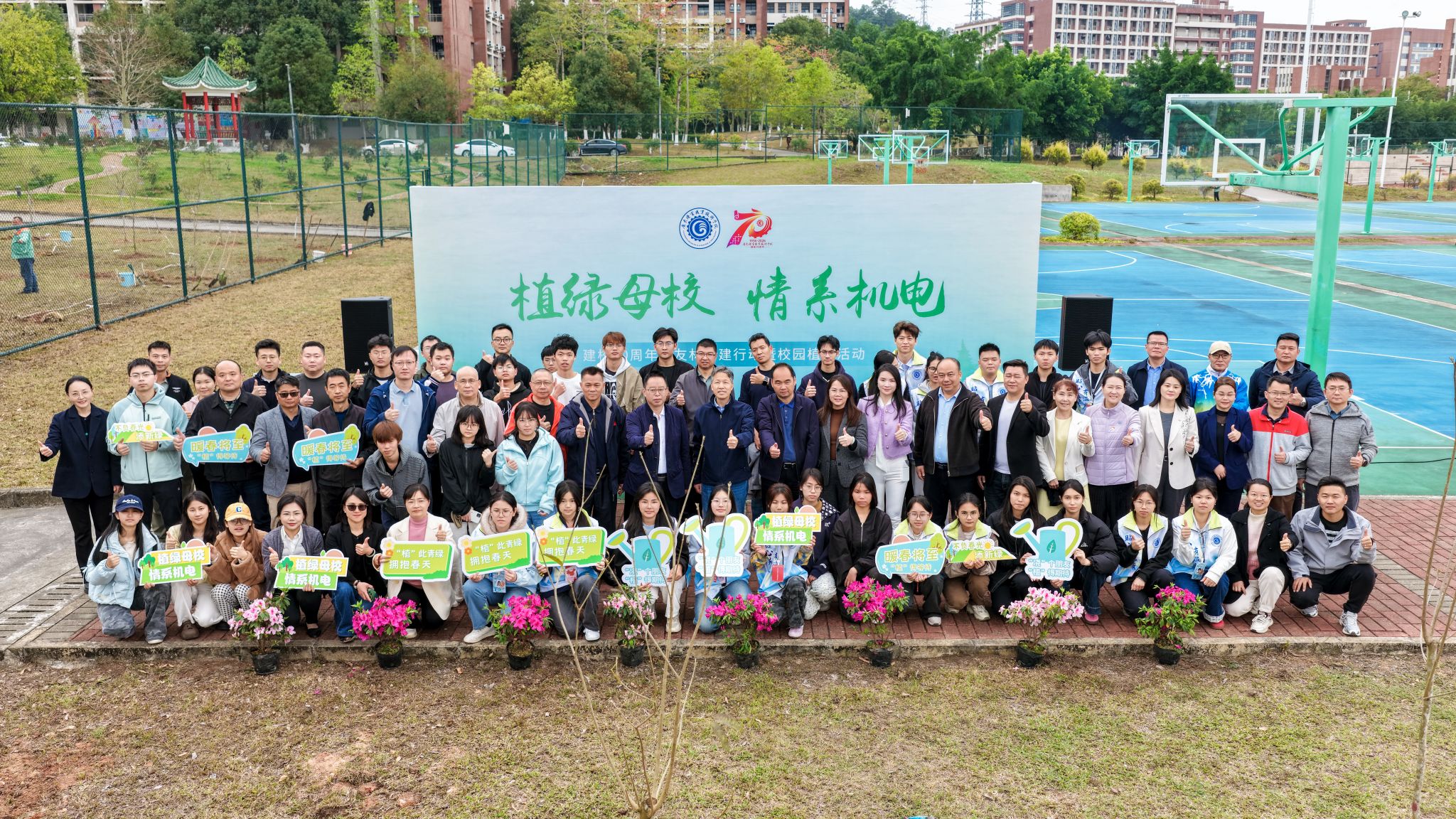 3月10日下午,广东机电职业技术学院“植绿母校 情系机电”建校70周年校友林共建行动暨校园植树活动在北校区篮球场东侧举行。学校党委书记李为民,党委副书记、校长漆军,党委委员、副校长刘怡军,党委委员、副校长郑广峰,校友会总会理事、广州分会会长陈文舒,总会监事长、佛山分会会长朱明珍,总会副会长、东莞分会副会长陈必勤,总会理事、云浮分会荣誉会长严崇杰,总会理事、汕尾分会会长庄梁航及分会代表范晓云、吴燕旋,海南分会副会长李祉涛等领导嘉宾出席活动,学校校庆办、党政办、学工部、总务部、保卫部、校团委、创新创业学院、校友会等部门负责人,各二级学院主管学生工作领导,以及校友代表、师生代表参加活动,以植绿护绿的实际行动,共同为母校70周年华诞献上深情厚礼,为“绿美机电”建设注入蓬勃生机。党委学生工作部负责人冯清云主持活动。