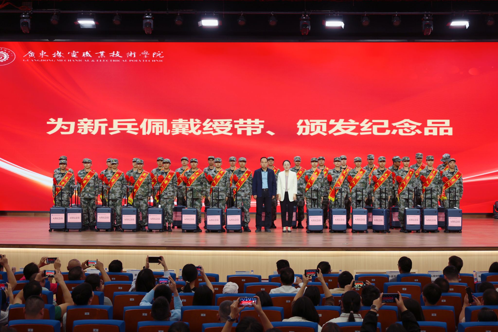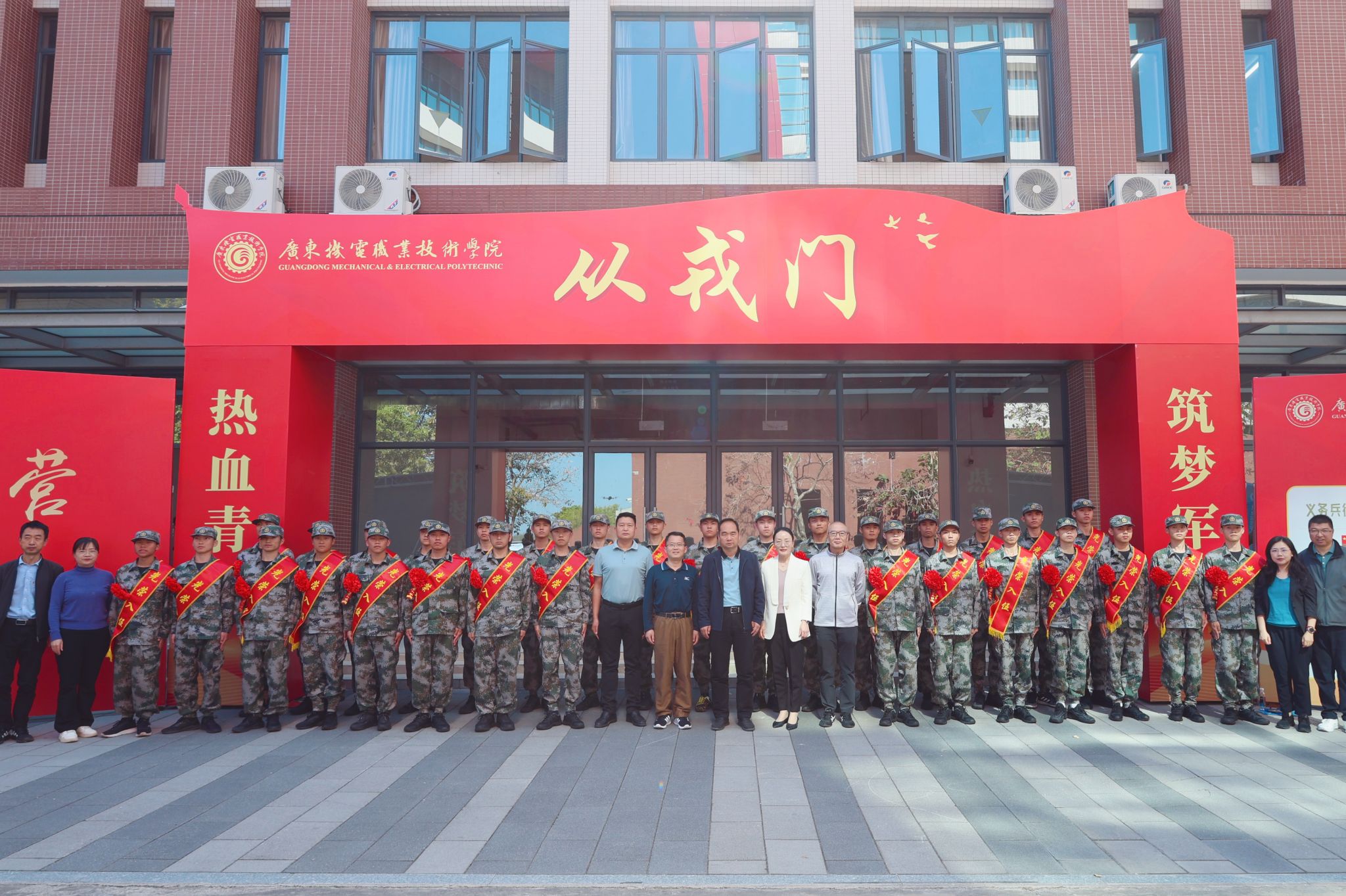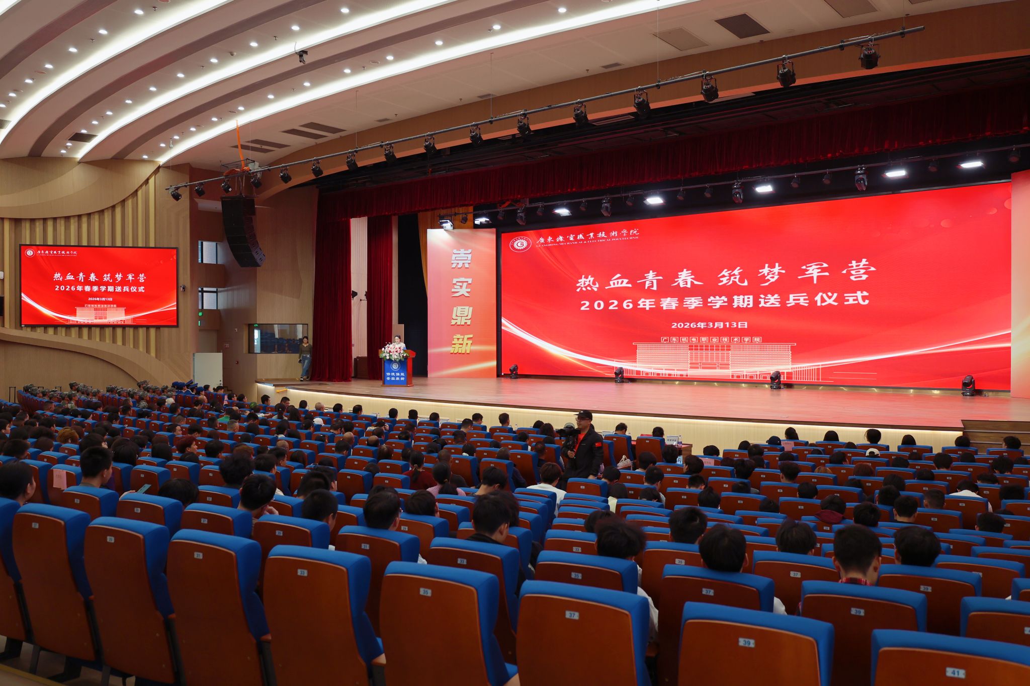 强国必须强军,军强才能国安。为欢送踏上保家卫国新征程的机电学子,3月13日下午,广东机电职业技术学院于北校区大礼堂举行“热血青春 筑梦军营”2026年春季新兵入伍欢送仪式。这既是一堂生动的国防教育思政大课,更是一次激荡爱国情怀的壮行盛举。机电青年以热血践忠诚,以行动护家国,正以崭新姿态开启无上荣光的军旅生涯。学校党委委员、副校长郑广峰出席活动并讲话,党委学生工作部(武装部)、保卫部、校团委等部门负责人、各二级学院主管学生工作领导、师生代表、入伍新兵及家长代表参加仪式,共同见证机电学子参军入伍的光荣时刻。