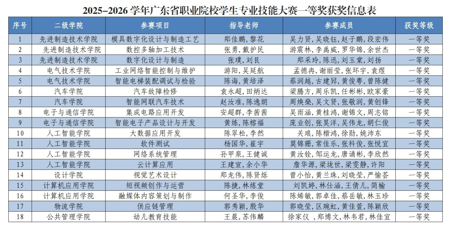 2025-2026学年广东省职业院校学生专业技能大赛一等奖获奖师生