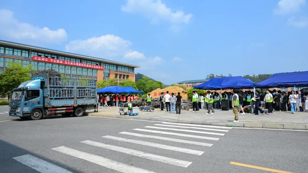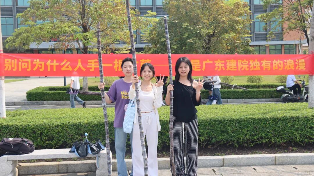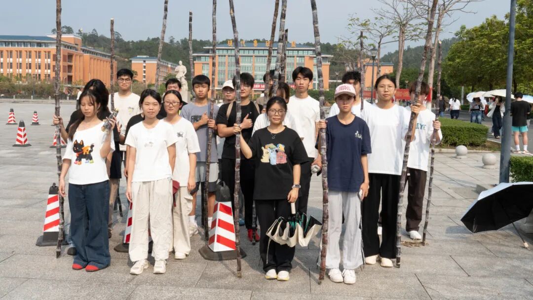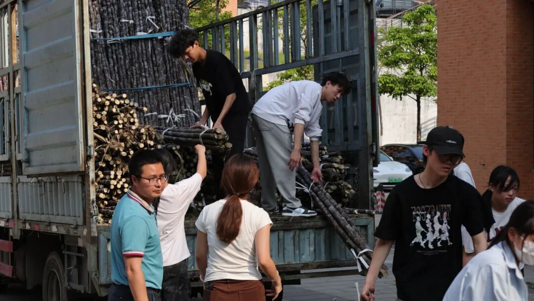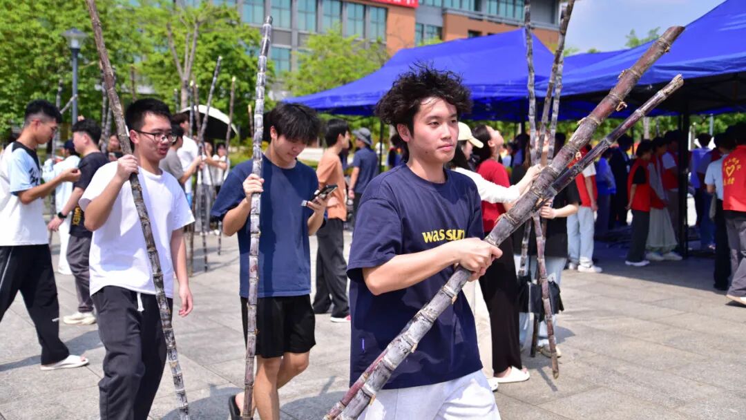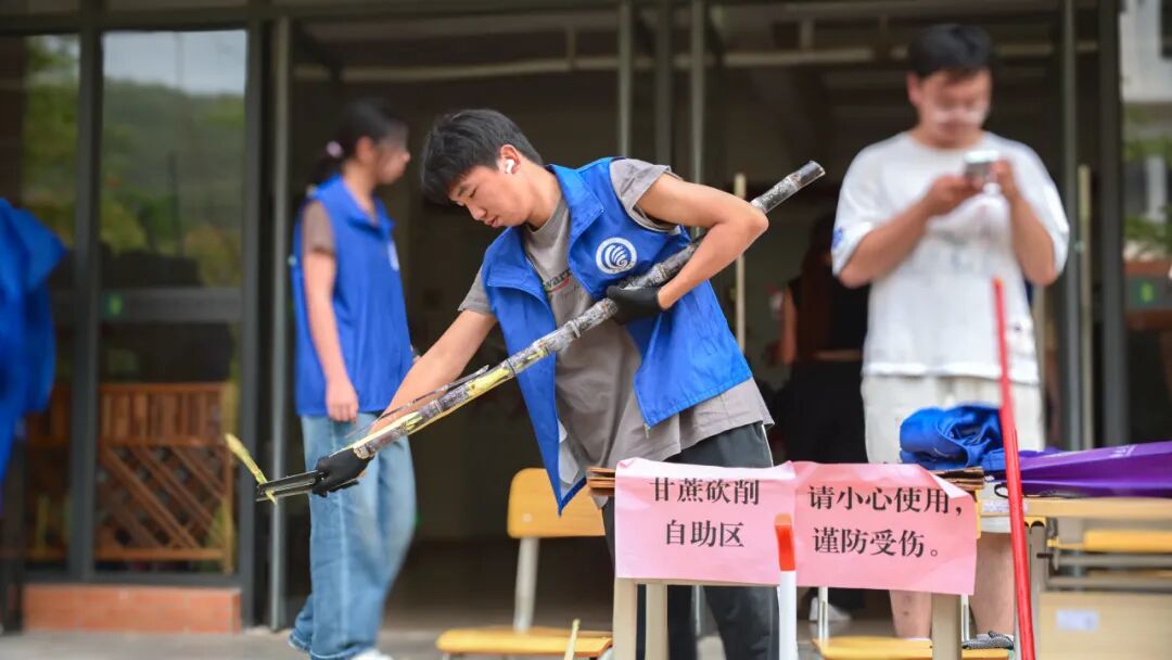 活动现场热闹有序,成为校园里最动人的风景。清远校区鲁班广场、广州校区综合楼前篮球场上,成捆的甘蔗整齐堆放。300多名工作人员和志愿者负责甘蔗搬运、分发、登记、砍削和秩序维护等工作,他们忙碌穿梭,有序引导师生领取。弯腰搬蔗的脊背汗水浸透了衣衫、沾着糖霜的指尖、被甘蔗叶划出细痕却笑意不减……负责为甘蔗削皮的学生,动作也快速娴熟起来。