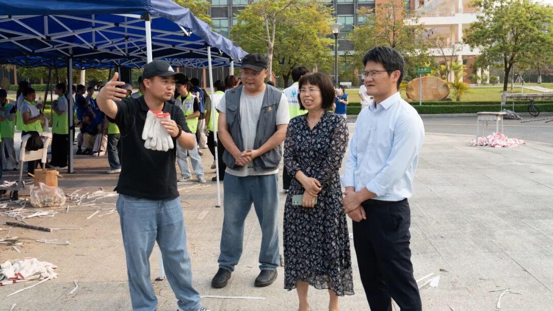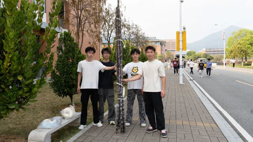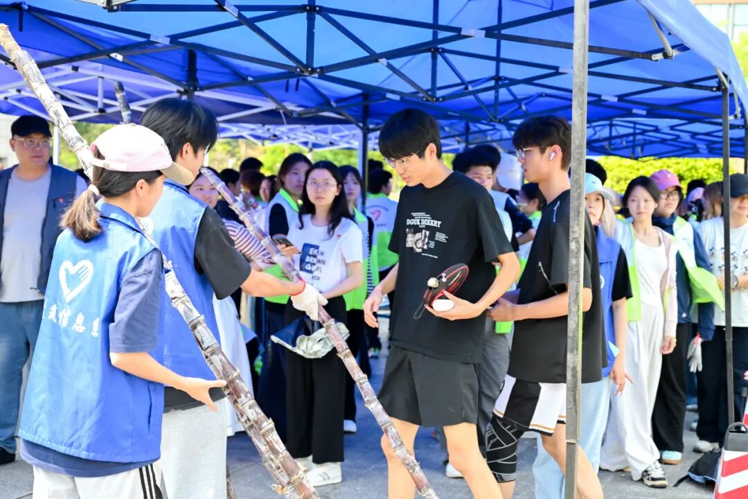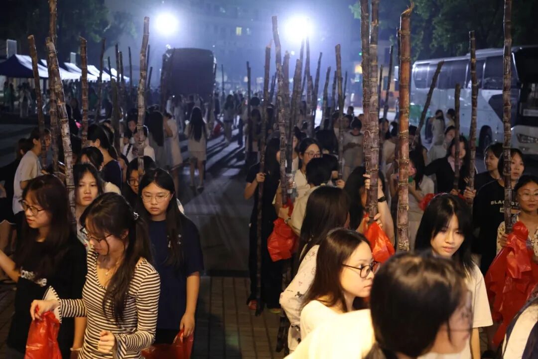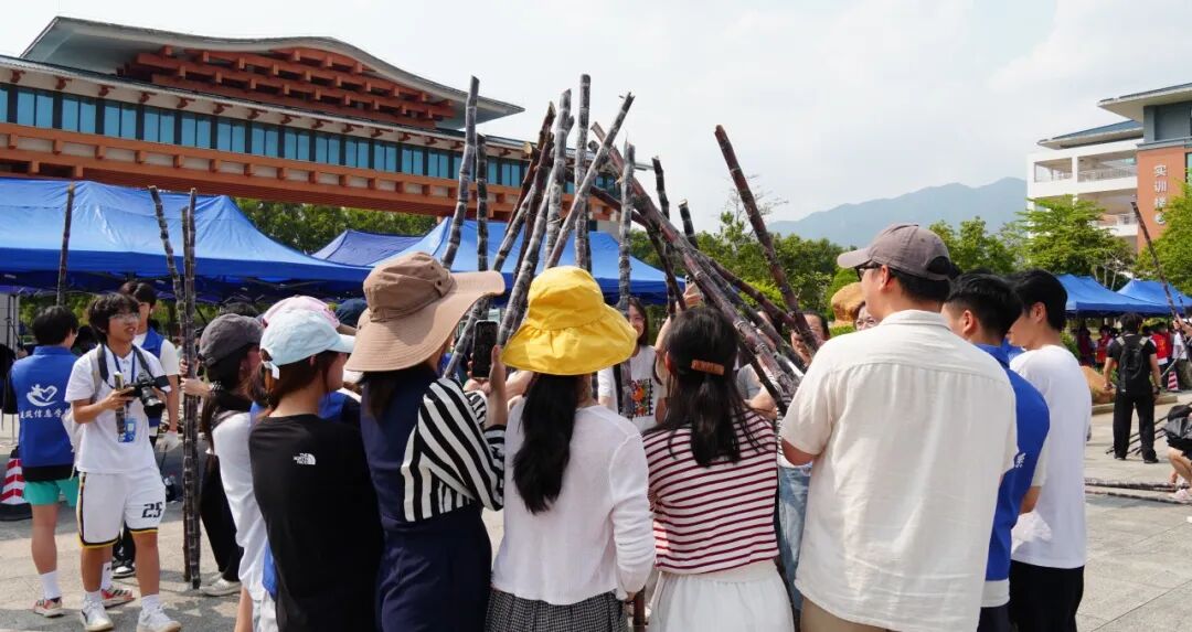 活动现场热闹有序,成为校园里最动人的风景。清远校区鲁班广场、广州校区综合楼前篮球场上,成捆的甘蔗整齐堆放。300多名工作人员和志愿者负责甘蔗搬运、分发、登记、砍削和秩序维护等工作,他们忙碌穿梭,有序引导师生领取。弯腰搬蔗的脊背汗水浸透了衣衫、沾着糖霜的指尖、被甘蔗叶划出细痕却笑意不减……负责为甘蔗削皮的学生,动作也快速娴熟起来。