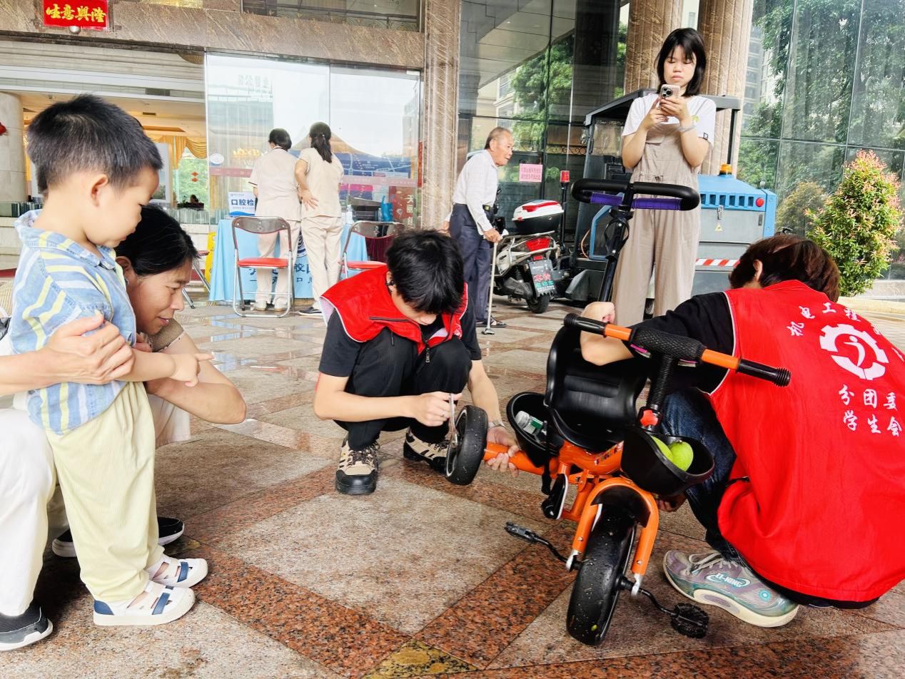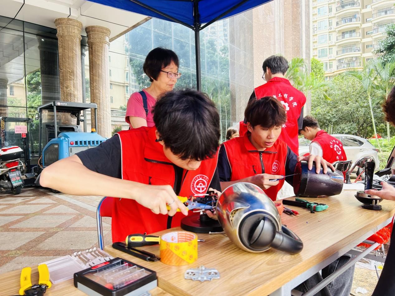 专业赋能民生,技能服务社区。活动现场,机电工程学院师生充分发挥专业优势,开设“便民家电服务站”,为社区居民提供家电维修与清洗服务。师生们耐心检测故障电器,细致讲解保养知识,累计修复电风扇、电饭煲、电水壶、电磁炉等小家电20余件,清洗空调、电风扇等家电40余台。“这些学生技术过硬、态度热情,真是帮我们解决了大问题!”居民张阿姨拿着修好的电热水壶连连称赞。