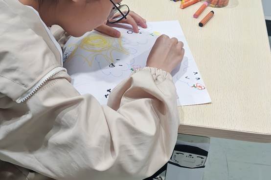 合作绘画是一种将艺术表达与心理互动相结合的独特方式,具有显著的心理疗愈价值。活动伊始,王老师便引导同学们开启了一场别开生面的艺术体验——在全程保持安静的状态下共同完成一幅画作。绘画完成后,王老师通过询问同学们的绘画思路,并引导回忆绘画时的心路历程,鼓励同学们表达内心的真实感受,充分释放心中隐藏的情绪。活动以非语言接力绘画与情感分享相结合的方式,引导参与者在艺术创作中实现情绪释放,进一步了解自我,从而建立更深度的人际联结。
