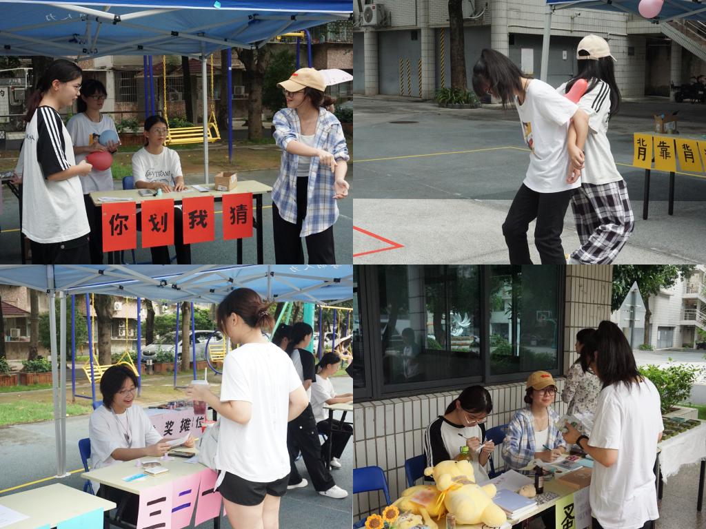 篮球场在文化节当天秒变欢乐海洋,热闹非凡。四个游戏摊位与兑奖投票区构成了一片欢乐的市集。“321看这边”摊位前,参赛者们在手指方向与转头方向的反逻辑挑战中展开激烈较量,现场不时爆发出阵阵欢呼声;“你画我猜”摊位前围满了跃跃欲试的同学,两人一组通过夸张的肢体语言传递词汇信息,默契配合的瞬间引得围观者频频鼓掌;“答非所问”摊位则秒变“脑洞竞技场”,参赛者们为避开问题陷阱频出金句,淘汰者的迷惑回答让现场笑声不断;“背靠背运球”摊位则上演着速度与协作的比拼,2人小组夹着气球冲刺,气球破裂时的惊呼与冲线时的欢呼交织在一起,将活动氛围推向高潮。各摊位前人头攒动,师生们手持游玩纸穿梭其中,在盖章闯关中感受着夏日限定的欢乐。