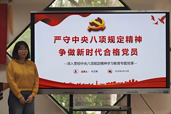 党课结束,杨召霞同志结合本次学习主题,分享了自己的心得体会。她指出,作为学生党员,应当坚持从自身做起、从小事做起,认真落实学生党支部的各项工作职责。通过将中央八项规定精神贯穿于日常学习和工作中,既能促进党员个人综合素质的提升,又能推动党支部建设取得实效。同时,她强调,这一过程也是支部党员之间相互学习、共同成长的宝贵机会,对加强基层党组织建设具有重要意义。