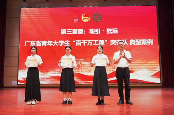 第三篇章:职引•致远。表彰我校获得全国职业规划大赛、“挑战杯”广东大学生课外学术科技作品竞赛、广东省“百千万工程”和三下乡社会实践等相关赛项的获奖者,并通过视频短片走进我校 “百千万工程” 的实践现场,展示青年学子如何将职业规划中的构想在实践中落地生根。随后,校舞蹈队带来精彩的民族舞蹈《八音破茧》。