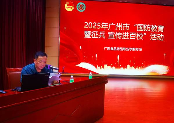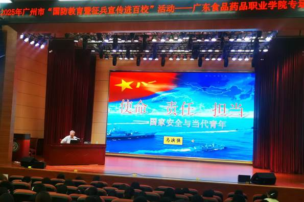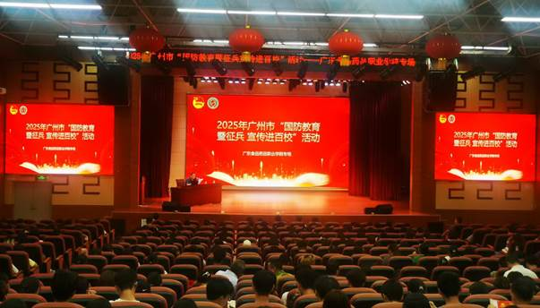 6月5日下午,在学校大礼堂隆重举行了“2025年广州市国防教育暨征兵宣传进百校—广东食品药品职业学院专场”活动。本次活动,坚持以国防教育为牵引,以征兵宣传为支点,构建“思想浸润+行动引领”的双向驱动模式,“实现短期征兵动员”与“长期国防育人”的有机统一为活动定位,采取“专家授课+政策解读”的方式展开。