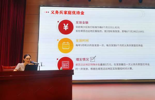 接下来,由广州市南沙区武装部、征兵办及退役军人事务局工作人员,分别对2025年广州市南沙区征兵工作安排、政治考核及大学生入伍优待政策等进行宣讲,让同学们对参军入伍的各方面政策有更直接、更进一步的了解。