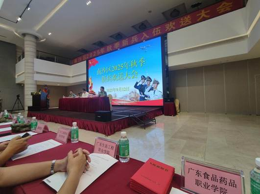 金秋送爽,壮志凌云。9月12日上午10时,学校武装部在南沙区资讯科技园迎宾楼会议中心参加由广州市南沙区人民政府征兵办公室举行的南沙区2025秋季新兵入伍欢送大会。学校武装部代表参会,为即将奔赴军营的5名新兵送行。