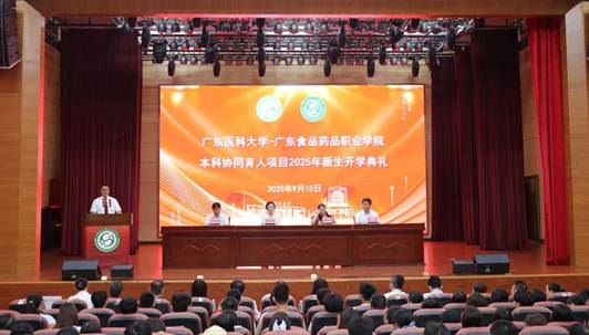 9月15日上午,广东医科大学-广东食品药品职业学院本科协同育人项目2025级新生开学典礼在学校韵园大礼堂举行。广东医科大学教务部主任周艳芳,学校党委副书记、校长张少兰,党委副书记周国平,党委委员、副校长李凌出席开学典礼。学校各相关职能部门负责人、各协同育人二级学院党政负责同志,教师代表、辅导员和2025级学生参加典礼。学校学生工作部部长廖阜主持开学典礼。