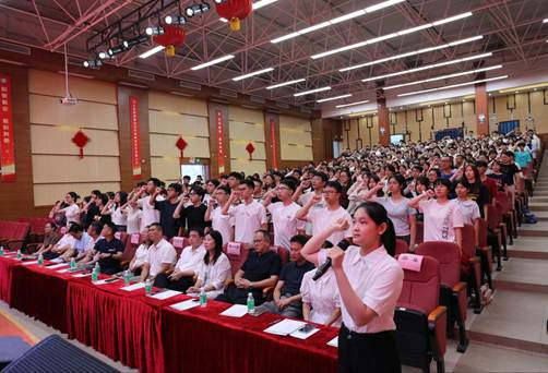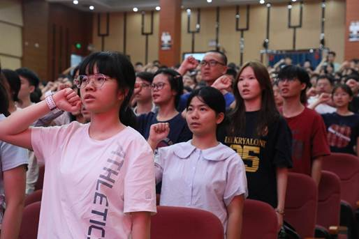 全体新生举起右拳许下入学誓言。开学典礼在全体师生齐声高唱《广东医之歌》的激昂旋律中落下帷幕。