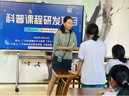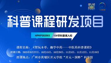 近日,由广州市黄埔区科学技术协会主办,广东食品药品职业学院承办的“2025年科普课程研发项目——《智玩本草,趣学中药——中医药科普课程》”在广州市黄埔区开元学校实施。