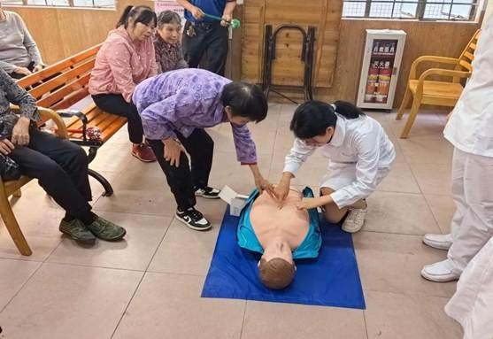 护理学院师生演示血压测量、心肺复苏等实用健康技能,并指导村民动手练习。