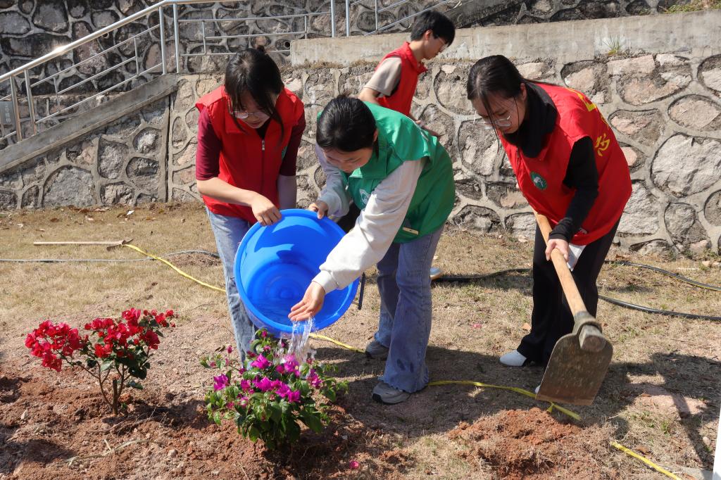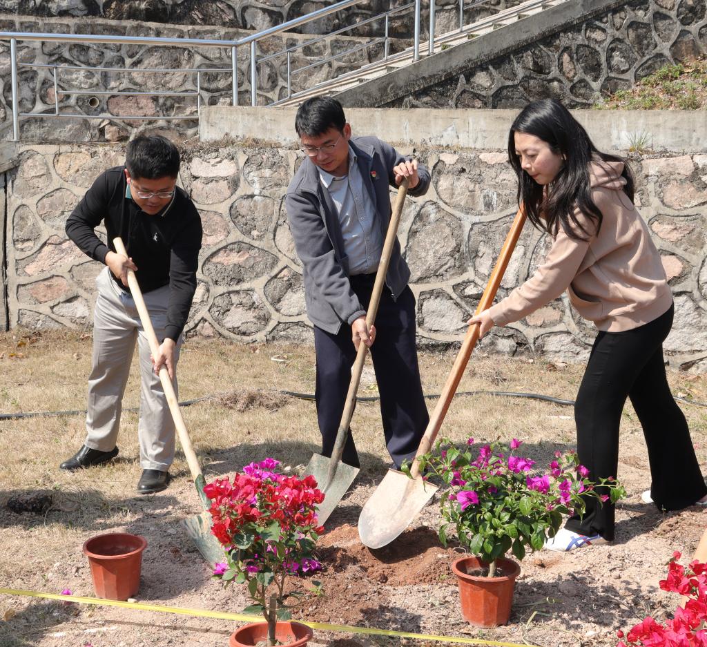此次主题植树活动共栽种三角梅等苗木60余棵,既是一堂贴近自然的劳动实践课,也是一场润物无声的“生态文明+心理健康”融合教育课,更是学院深化心理育人、践行志愿服务的具体举措。师生在亲手栽种的过程中,深刻体悟植树造林的生态意义,理解“绿水青山就是金山银山”的时代内涵,也在园艺疗愈中调节情绪、缓解压力,学会与自然共处、与自我和解。