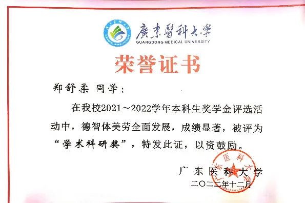 她曾获“国家奖学金”、“湛江市优秀学生骨干”、“优秀共产党员”、“学业一等奖学金”、“学术科研奖”、“优秀志愿者”等 30 余项荣誉。