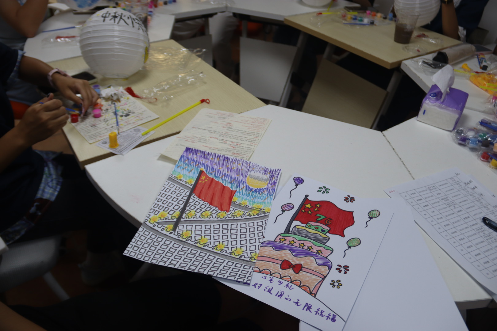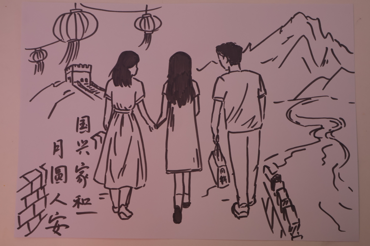 活动提供空白小卡片,参与者用彩笔绘制家庭场景、爱国元素(如国旗、华表)或校园生活,并写下1句节日祝福(卡片可带走留念)。