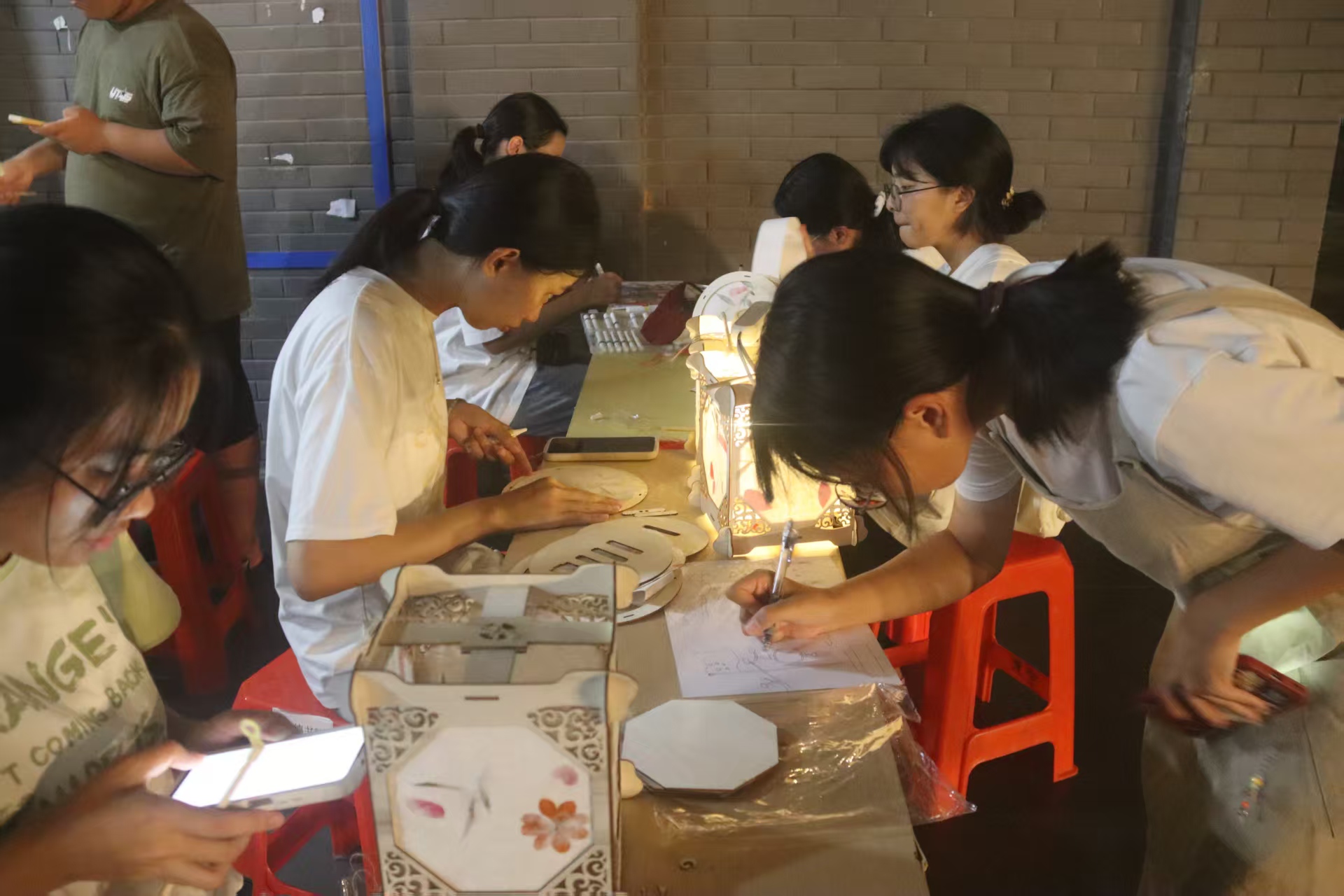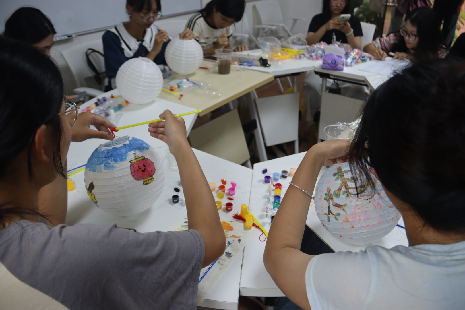 同学们正精心制作灯笼