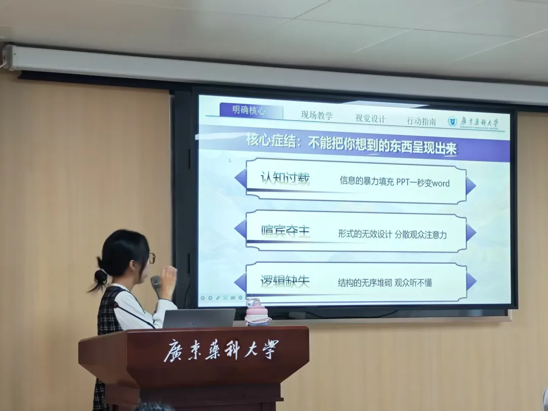 活动现场座无虚席,氛围格外热烈。冼佳慧从PPT制作的核心逻辑展开分享,一开场便精准戳中同学们的痛点。“很多同学做PPT总爱‘想到什么写什么’,最后内容杂乱无章,导致观众根本抓不住重点。”紧接着,她结合自身经验给出建议:制作PPT前必须先明确目标,再像搭积木一样搭建清晰的思维框架,才能让内容既有逻辑又有重点。
